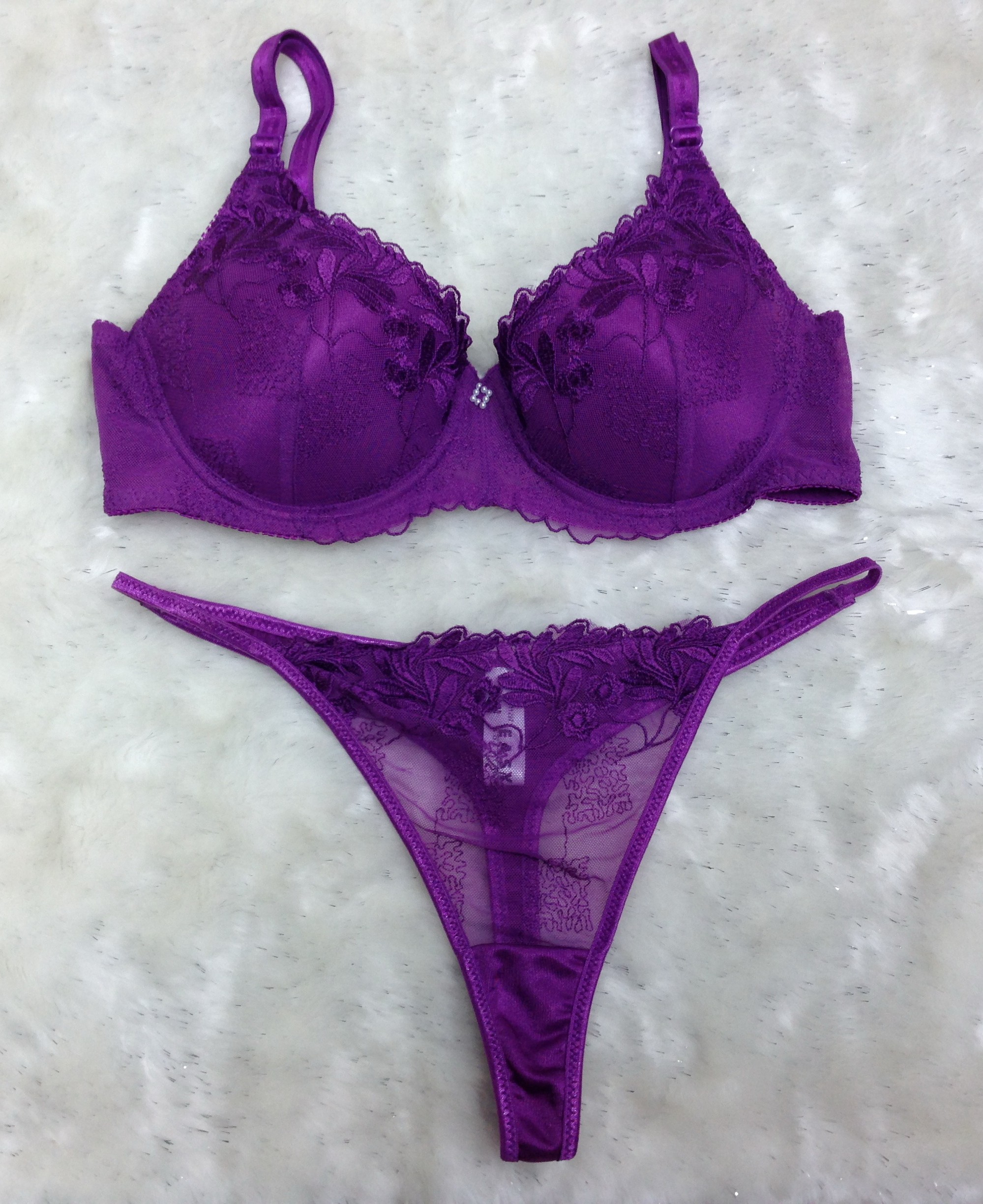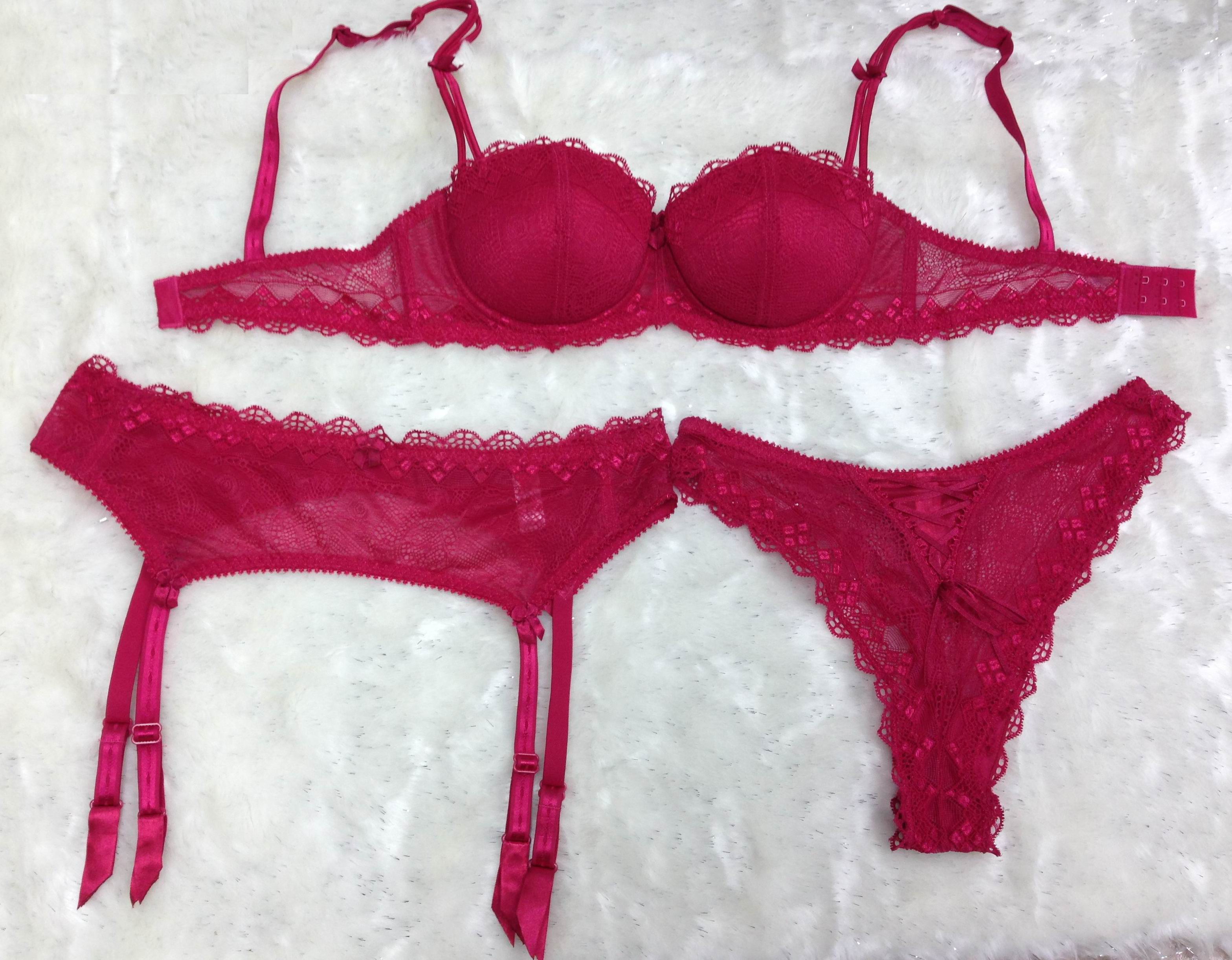 ![]() | Balconette Bra | Garter Belt | Thong– Solid color – Removable pad in cups – Moulded cups |