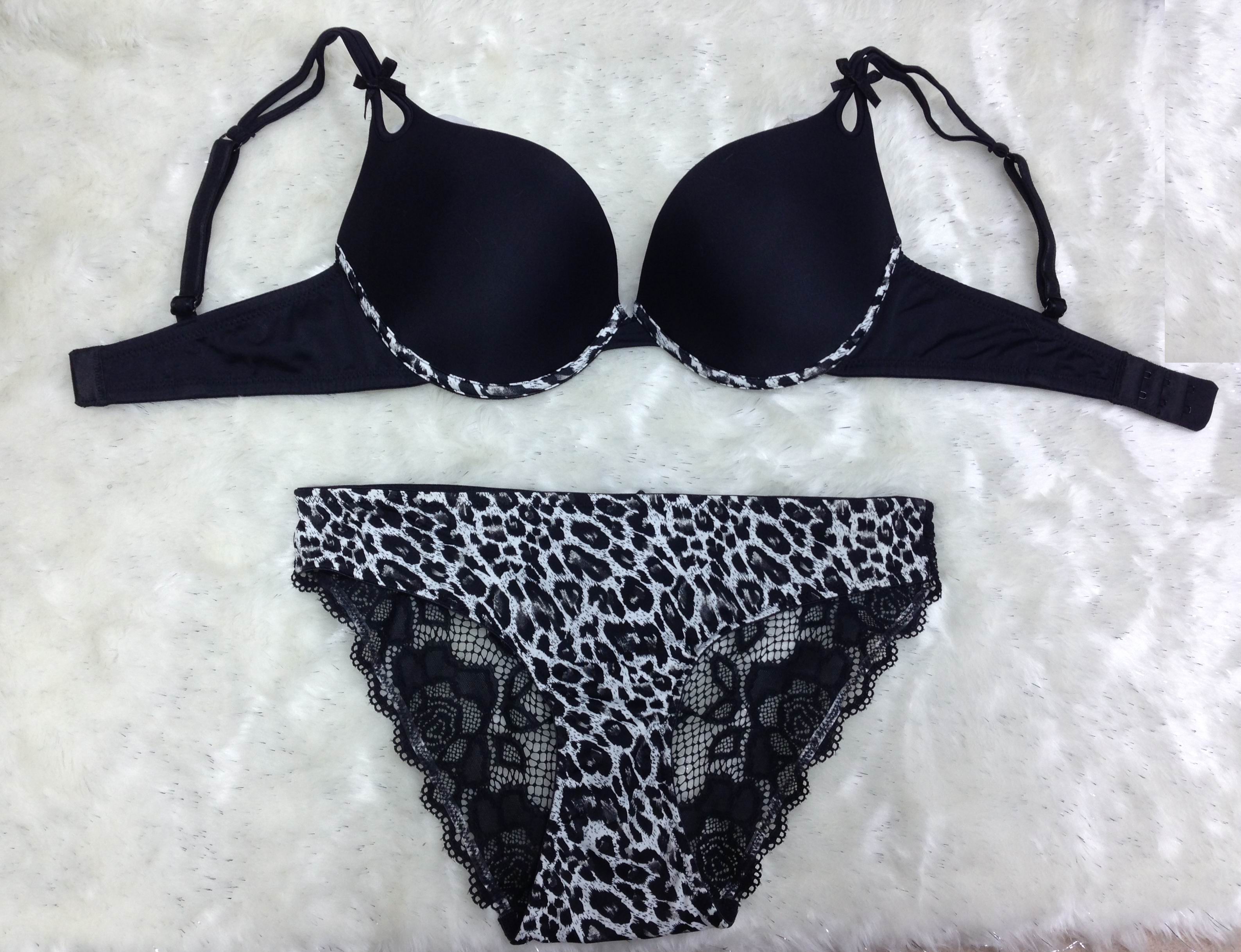 Extreme push-up bra & bikini– Solid color with leopard print – Have a key hole at top edge of cup – Moulded cups – Microfiber fabric: 82% Nylon / 18% Elastane 180gsm |