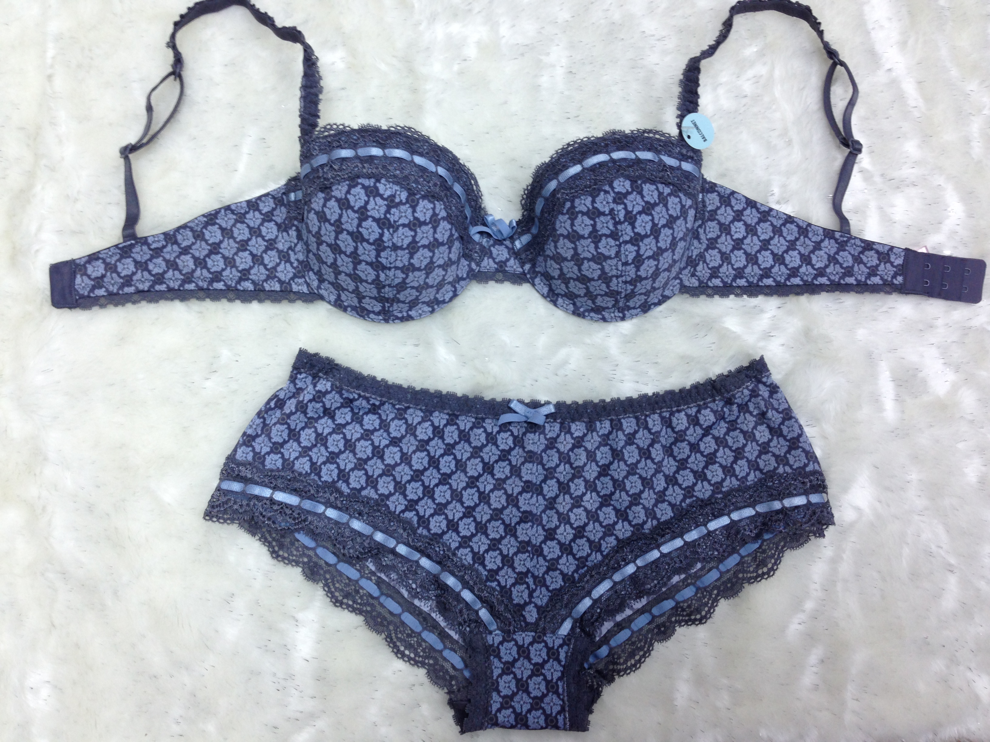 ![]() | Demi bra & Boyleg– Printed fabric – Contrast ribbonrun inserted in lace – Moulded cups |